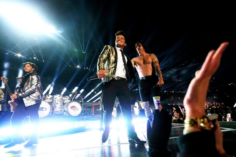 Pepsi Super Bowl XLVIII Halftime Show EAST RUTHERFORD, NJ - FEBRUARY 02: Bruno Mars and Anthony Kiedis of the Red Hot Chili Peppers perform during the Pepsi Super Bowl XLVIII Halftime Show at MetLife Stadium on February 2, 2014 in East Rutherford, New Jersey. (Photo by Jamie Squire/Getty Images) (Jamie Squire/Getty Images)