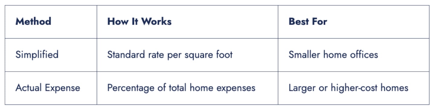 Under the actual expense method, deductible costs may include a portion of mortgage interest, property taxes, utilities, insurance, and maintenance, based on the percentage of the home used for business.