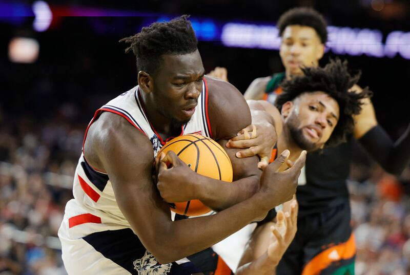 Amana Sonaga led UConn with 21 points and added 10 rebounds. Isaiah Wong led the Hurricanes in scoring with 15 points.